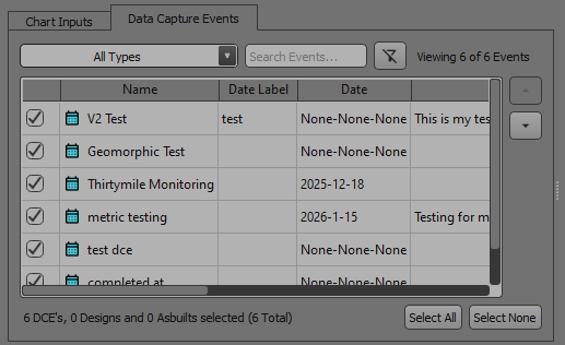 The Data Capture Events tab allows users to select which events they want to include in the chart. The events are initially loaded based on the properties of the selected Analysis. This control allows you to select, deslect and reorder the events that are included in the chart. Changes made in this tab will directly affect which events are displayed along the x-axis of the Analysis over Time chart.