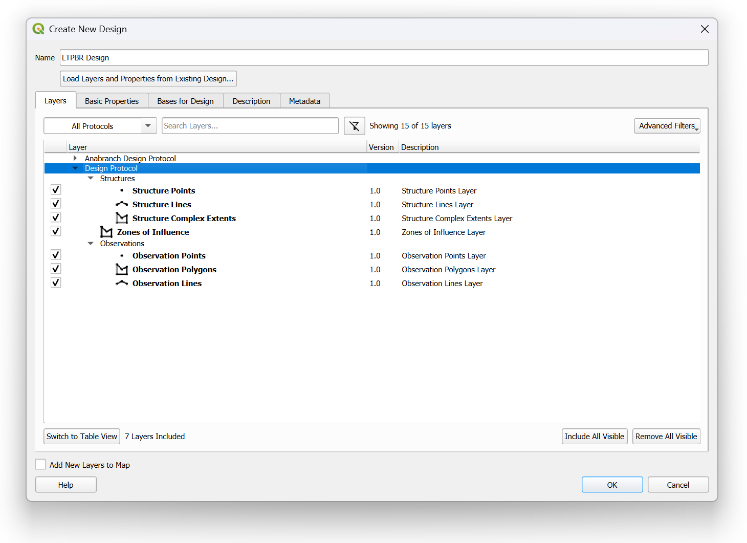 After creating a Design, a dialog window will appear where you customize the Design with point, line, and polygon layers sourced from the protocol library. This includes both a tree view (shown in the screenshot) and a table view. You have the flexibility to use as many layers as needed, drawing from a single protocol or combining elements from multiple protocols. Use the upper left drop down menu to select the design protocol(s) you want to use. You can add layers to the Design by expanding the protocol tree and selecting layers of interest (i.e., checking the layer box) or search for specific layers in the search bar. Under Advanced Filters, the user can filter layers that have been selected or ones contained within experimental protocols.
